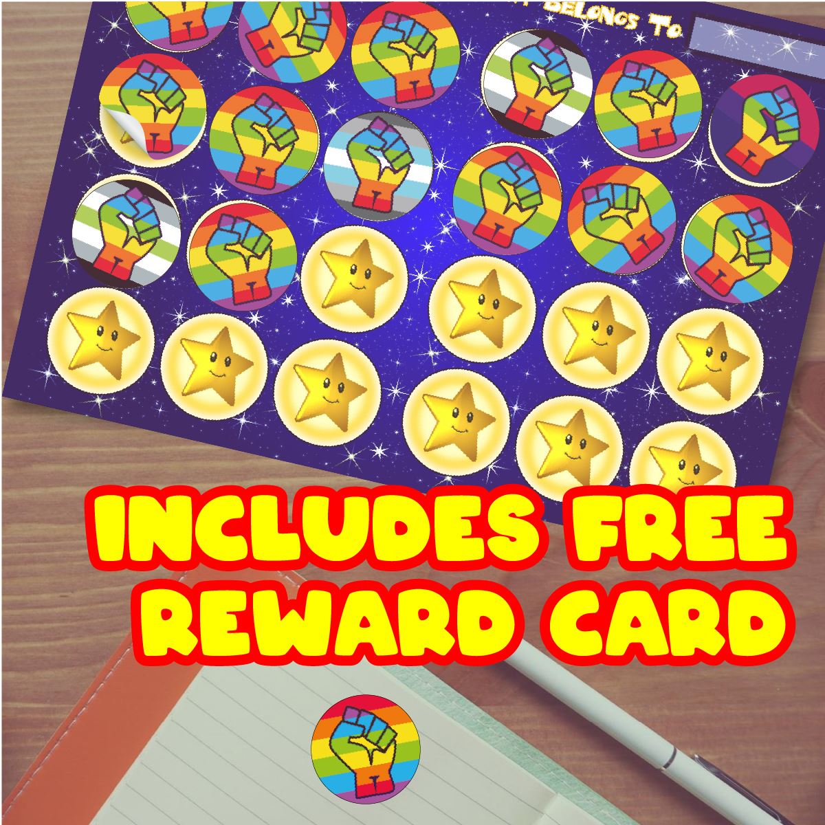 Great value with 144 LGBTQ+ Pride Rainbow Fists Reward Stickers per pack.