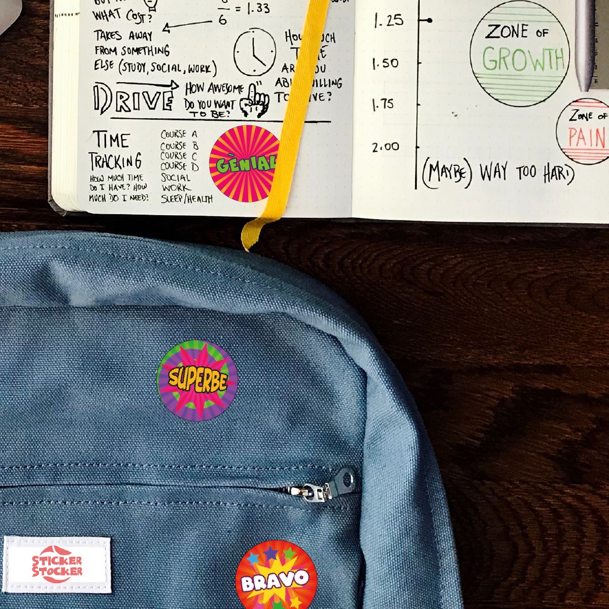 144 Funky French Praise Word Stickers - 30mm Glossy Reward Stickers for Teachers & Parents