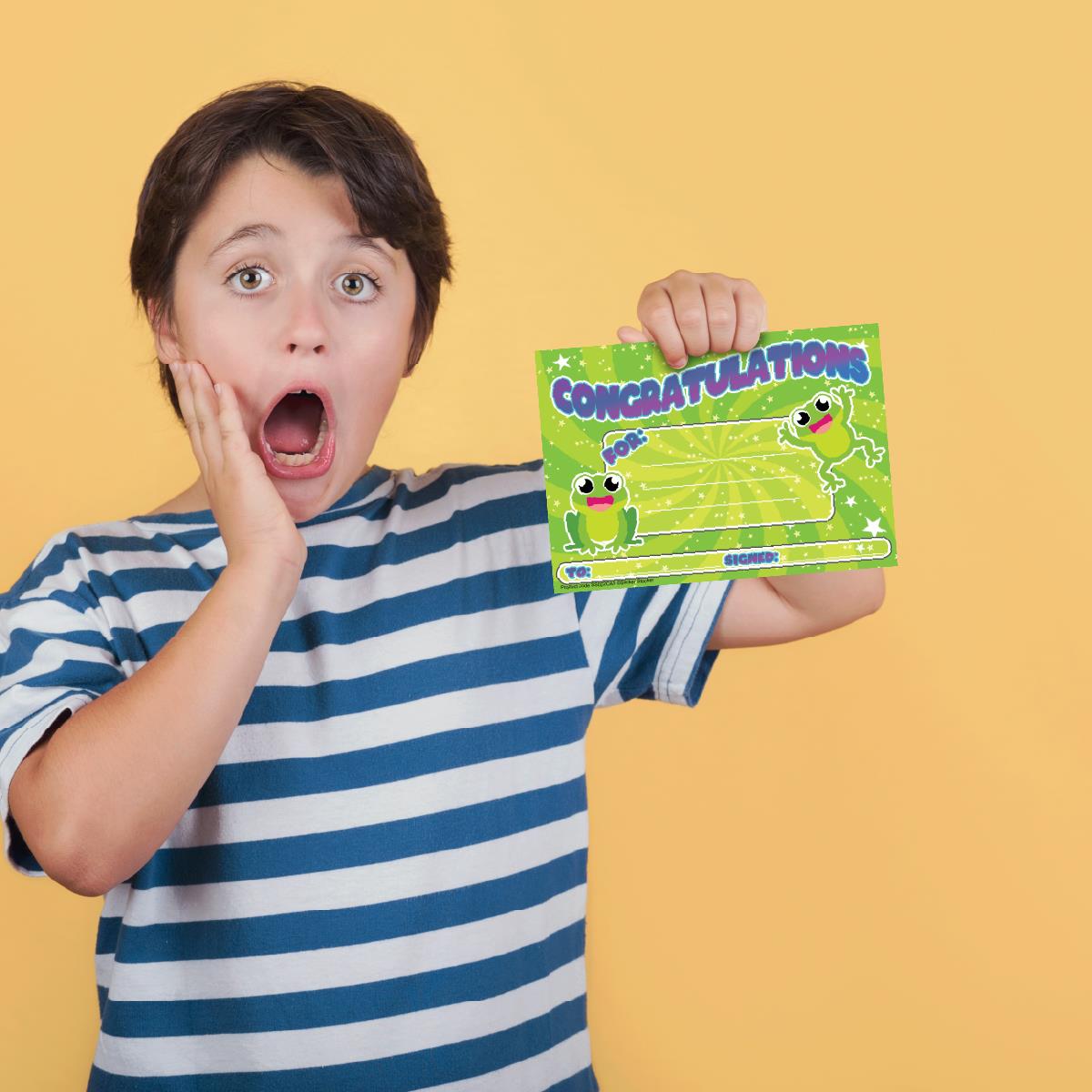 Reward any occasion, progress and achievement with this 30 pack of cheerful A5 Congratulations Frog themed certificate awards. Printed on 250gsm silk finish cad and ready to personalise.