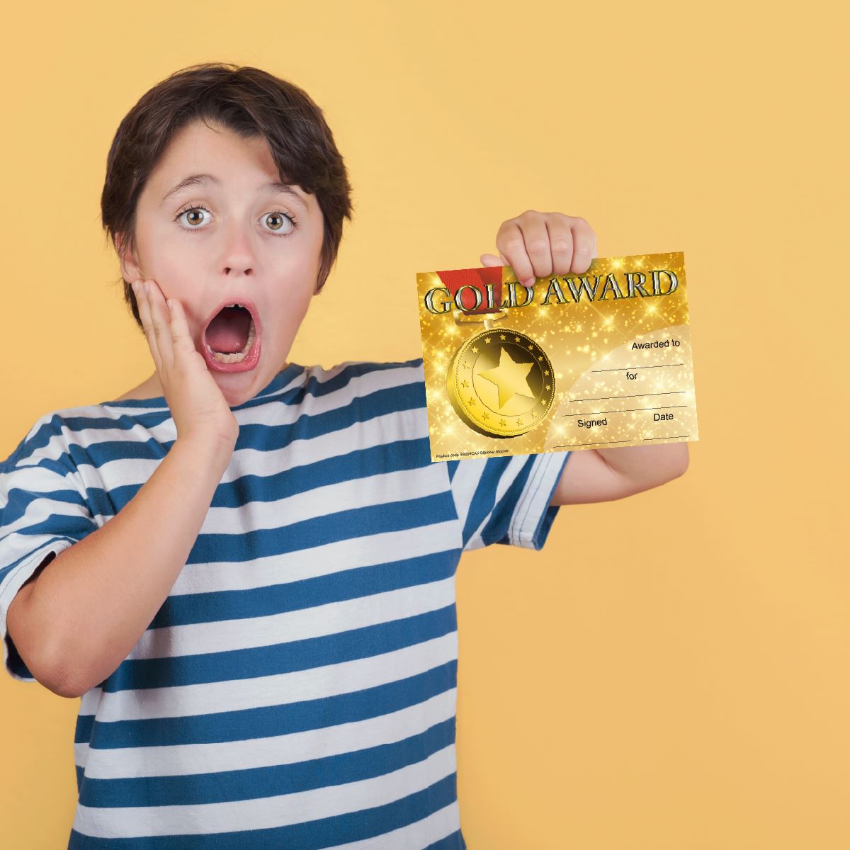 Watch their face light up when you reward them with a Gold Award certificate. Make someone in the class feel special and standing out from the crowd. The certificate features a bright and cheerful design, kids will feel proud to take home and display. Printed on high grade 250gsm silk finish card each pack contains 30 certificates that are easy to write on and ready to use. Perfect for hand written personalisation and can be customised to any task achieved.