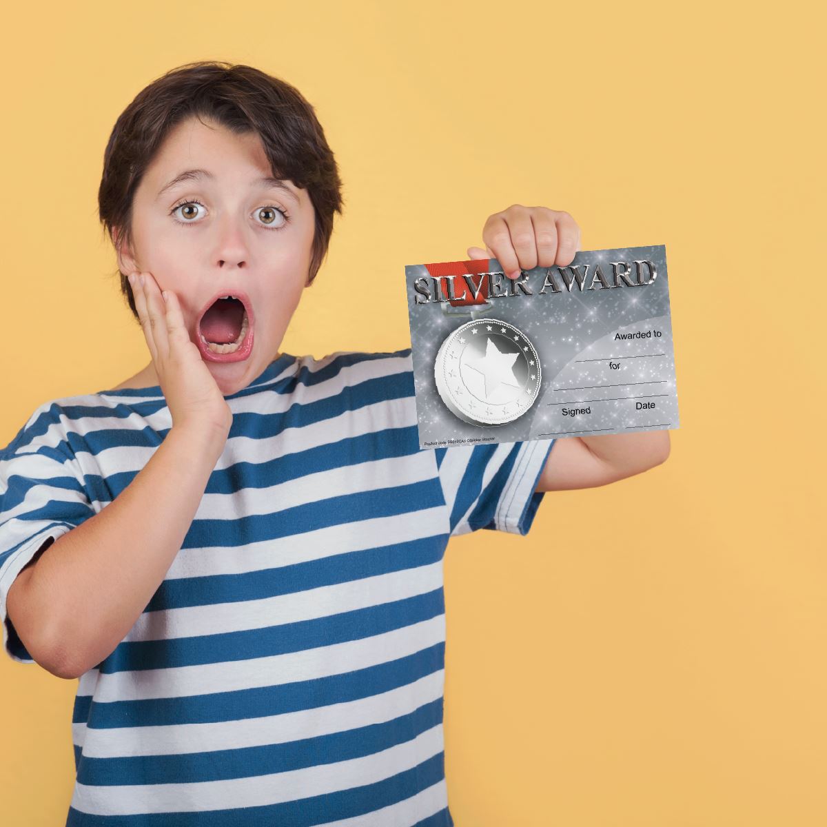 Watch their face light up when you reward them with a Silver Award certificate. Make someone in the class feel special and standing out from the crowd. The certificate features a bright and cheerful design, kids will feel proud to take home and display. Printed on high grade 250gsm silk finish card each pack contains 30 certificates that are easy to write on and ready to use. Perfect for hand written personalisation and can be customised to any task achieved.