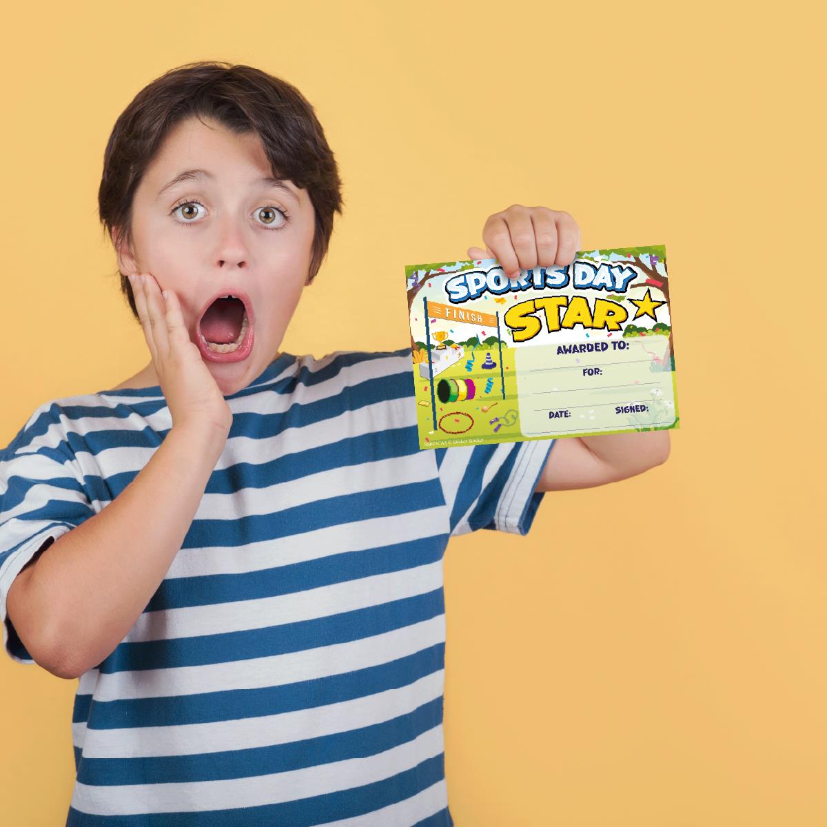 Celebrate achievements in style with our 30-Pack of A5 Sports Day Star Certificates, printed on premium 250gsm satin card. Perfect for honouring the hard work, dedication, and sportsmanship of participants, these certificates offer a professional, high-quality finish that stands out. The satin finish enhances the vibrant design, giving each certificate a sleek and polished look. Whether for a school, club, or community event, these A5 certificates are the ideal way to commemorate a memorable Sports Day. With a generous pack of 30, you €™ll have enough to reward all your champions. Show your appreciation with this elegant, durable, and easy-to-present certificate pack.