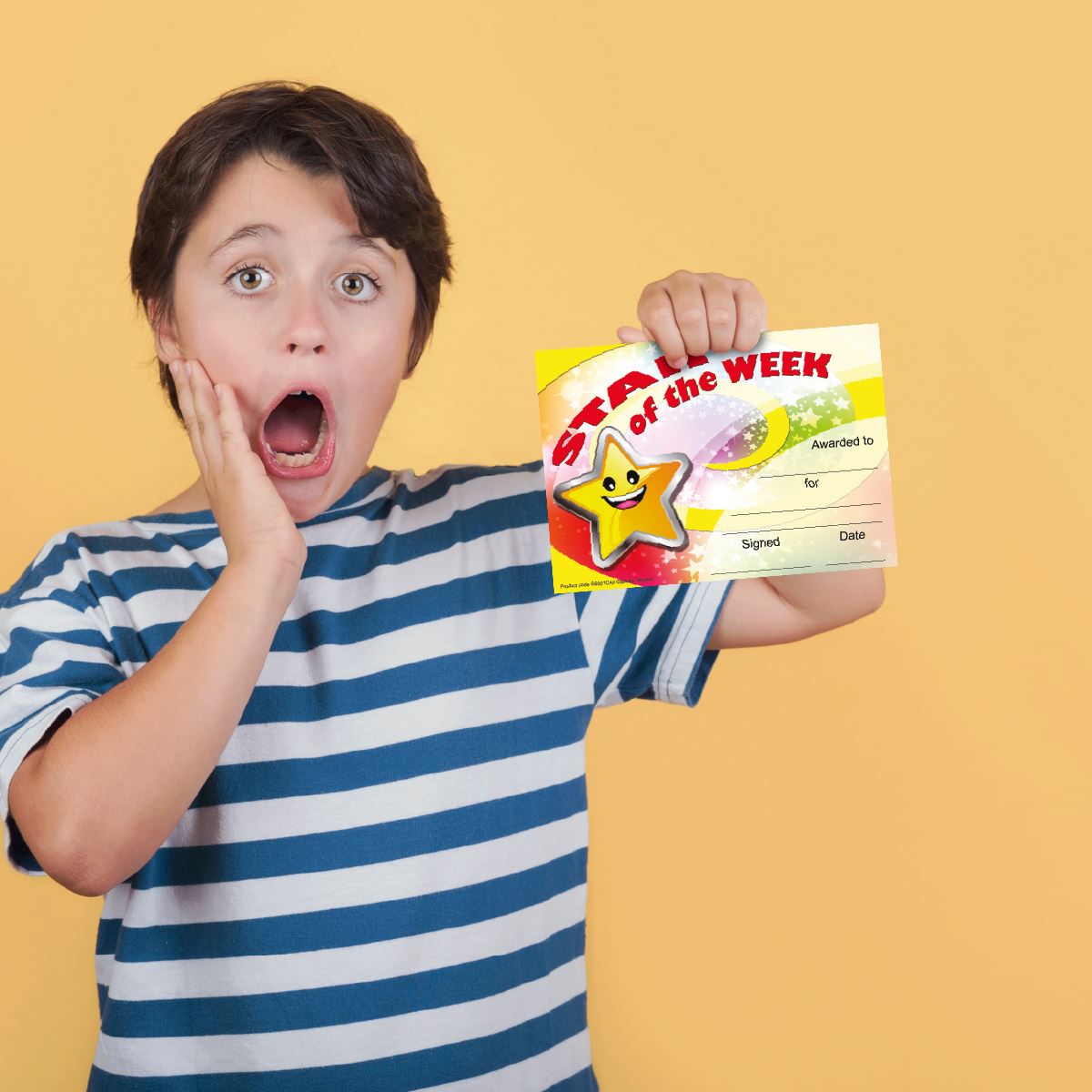 Reward pupil progress and achievement with this 30 pack of cheerful A5 Star of the week certificate awards printed on 250gsm silk finish cad and ready to personalise.