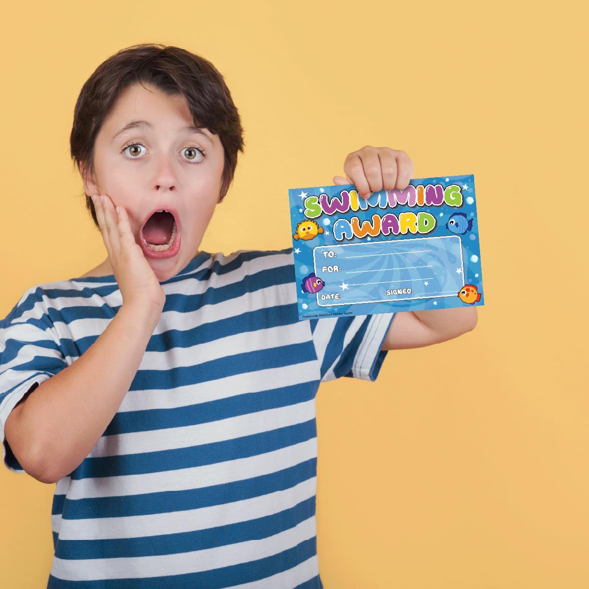 Give your kids a sense of achievement with these Swimming themed Award certificates to mark their progress. Kids will feel proud to take home and display these colourful awards printed on high grade 250gsm silk finish card, each pack contains 30 certificates that are easy to write on and ready to use. Perfect for hand written personalisation and can be customised to any task achieved.