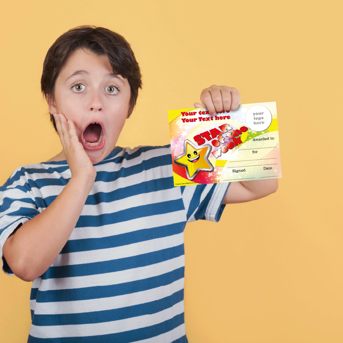 Watch their face light up when you reward them with a Star of the Week award certificate. Make someone in the class feel special and standing out from the crowd. The certificate features a bright and dignified design. Kids will feel proud to take home and display these Excellence awards printed on high grade 250gsm silk finish photo paper. Upload your own 2 lines of text that will be displayed on the top of the certificate and your own logo/image, the spacious task/signed and date lines are perfect for hand written personalisation and can be customised to any task achieved.